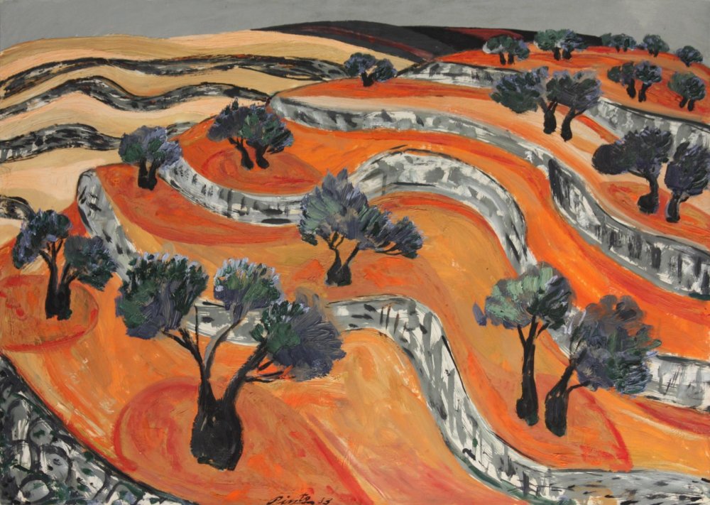 Los olivos, distribuidos estratégicamente en diferentes planos, refuerzan la sensación de perspectiva, creando una composición equilibrada. Miguel Pinto emplea una paleta cromática intensa, donde predominan los tonos naranjas y ocres, evocando la calidez de la tierra y el carácter árido del paisaje. Estos colores contrastan con el verde oscuro y azulado de los olivos, que aportan frescura y equilibrio visual.