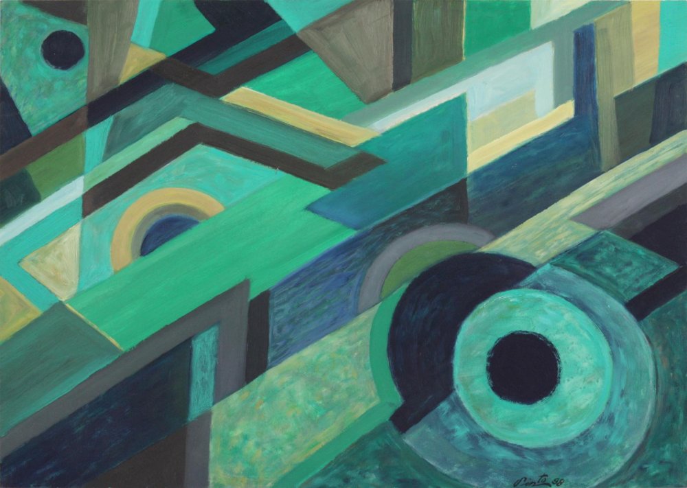 En Fases, Miguel Pinto construye un cosmos geométrico en verdes y turquesas vibrantes, donde círculos concéntricos y semicírculos negros evocan el ritmo cíclico de las fases lunares: creciente, llena y menguante##. Triángulos y líneas quebradas enmarcan estas formas celestes, sugiriendo un orden cósmico dinámico, mientras toques ocres calientan el fondo frío.