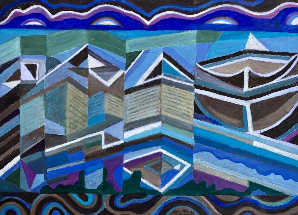 Esta obra de Miguel Pinto representa el mar a través de una interpretación abstracta, donde los barcos emergen como estructuras geométricas fragmentadas##. Las formas angulosas y los planos de color evocan embarcaciones integradas en un paisaje marino dinámico, dominado por azules profundos y ritmos ondulantes.