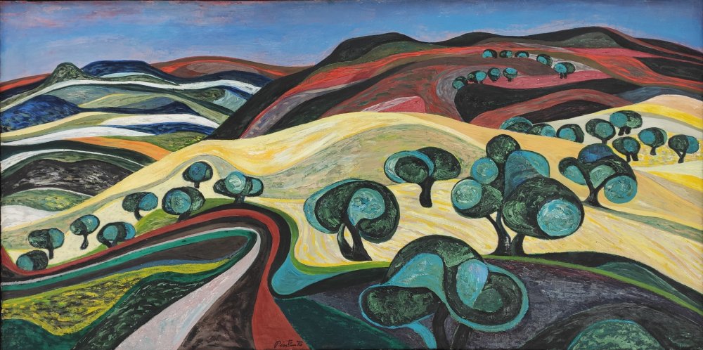 Este cuadro presenta un paisaje vibrante, caracterizado por colinas ondulantes, caminos sinuosos y árboles de formas redondeadas que se distribuyen armoniosamente##. La perspectiva no sigue un enfoque tradicional, sino que se construye mediante planos superpuestos y una organización geométrica del espacio, donde las curvas dominan la escena, aportando dinamismo y fluidez a la composición.