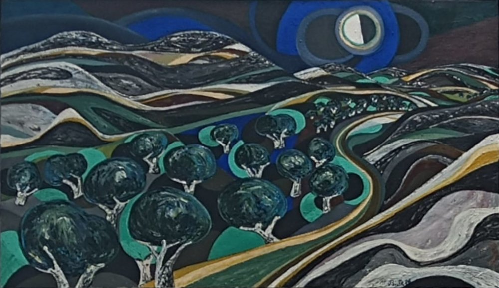 Este cuadro presenta un paisaje nocturno estilizado con una fuerte carga expresiva, donde la combinación de formas curvas, colores fríos y contrastes de luces y sombras generan una atmósfera enigmática y dinámica. La composición geométrica y fluida refuerza la sensación de movimiento, mientras que la luna se convierte en un punto focal que dota a la escena de un aire místico.
