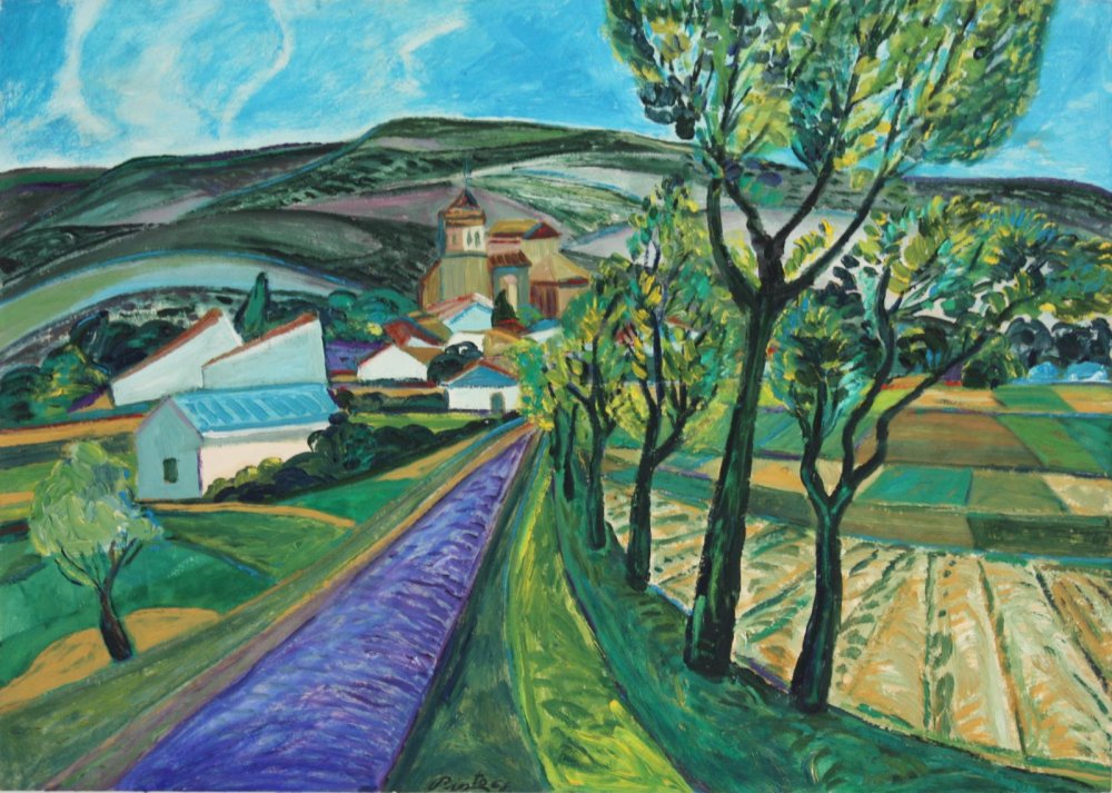 Los árboles que flanquean el camino introducen un ritmo vertical que contrasta con las bandas horizontales de la vega y las curvas de las colinas, generando una composición dinámica, casi musical. La gama de verdes intensos, el violeta del camino y el azul luminoso del cielo transforman el motivo rural en una visión jubilosa y vitalista, donde el color y la línea curvada convierten el paisaje cotidiano en una imagen abiertamente expresiva, fiel al lenguaje personal del artista.