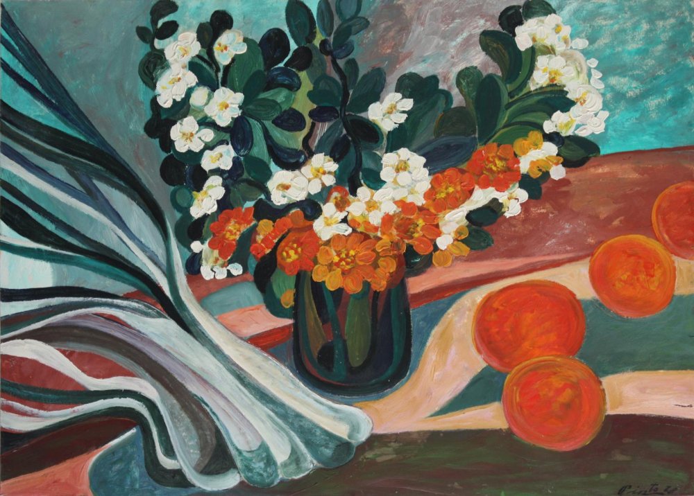 La obra “Bodegón de puerros y naranjas” refleja la manera en que Miguel Pinto reinterpretó géneros clásicos desde una perspectiva personal, con una pincelada expresiva y un lenguaje cromático propio##. La composición equilibra un ramo de flores en un jarrón central con puerros a la izquierda y un grupo de naranjas dispersas a la derecha, mientras que el fondo dinámico, con formas ondulantes y contrastantes, da profundidad a la escena y rompe con la rigidez tradicional de los bodegones.