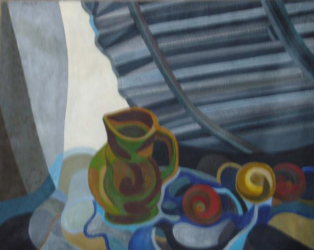 En esta pintura, un motivo aparentemente sencillo —una persiana, una jarra y elementos dispuestos sobre una superficie— se convierte en una construcción plástica de gran fuerza compositiva##. Las formas se estilizan y se delimitan con contornos definidos, mientras los colores intensos y contrastados aportan tensión y dinamismo a la escena.
