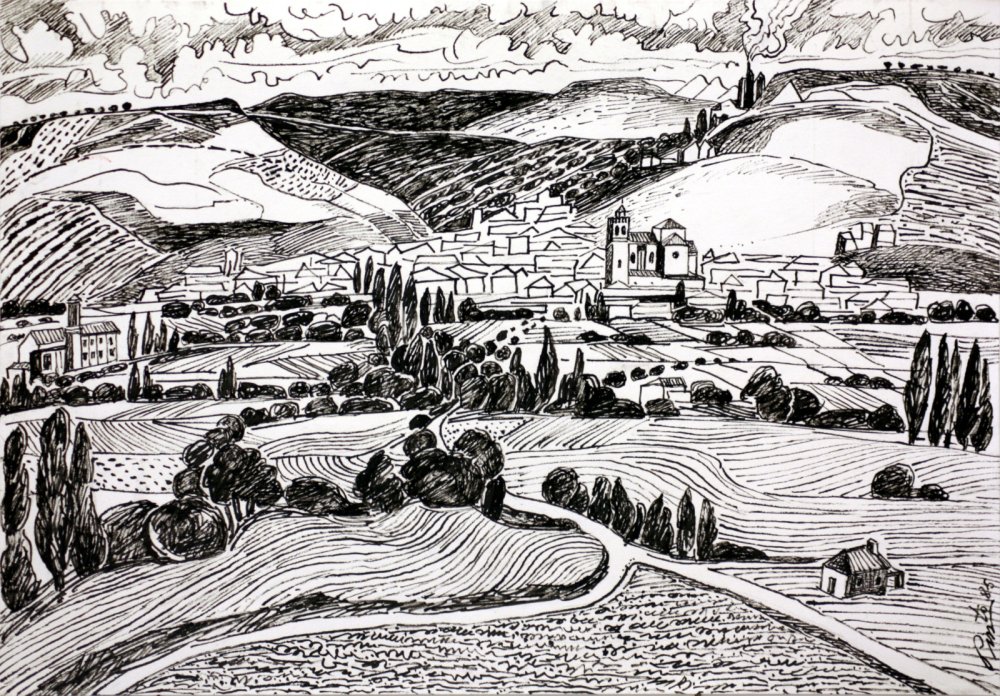 Tinta china de Miguel Pinto que presenta una amplia panorámica de su pueblo natal, con campos, alamos y la torre de la iglesia como ejes centrales##.