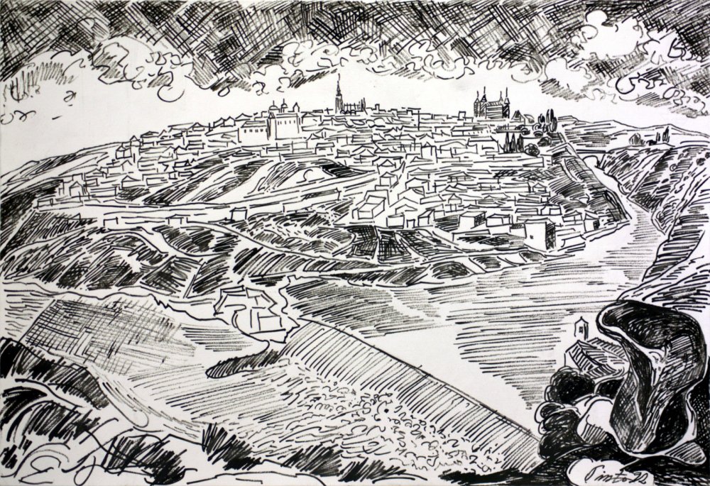Lejos de una representación detallada, Miguel Pinto transforma Toledo en una síntesis expresiva, donde arquitectura, naturaleza y atmósfera conviven en armonía dentro de un mismo lenguaje gráfico.