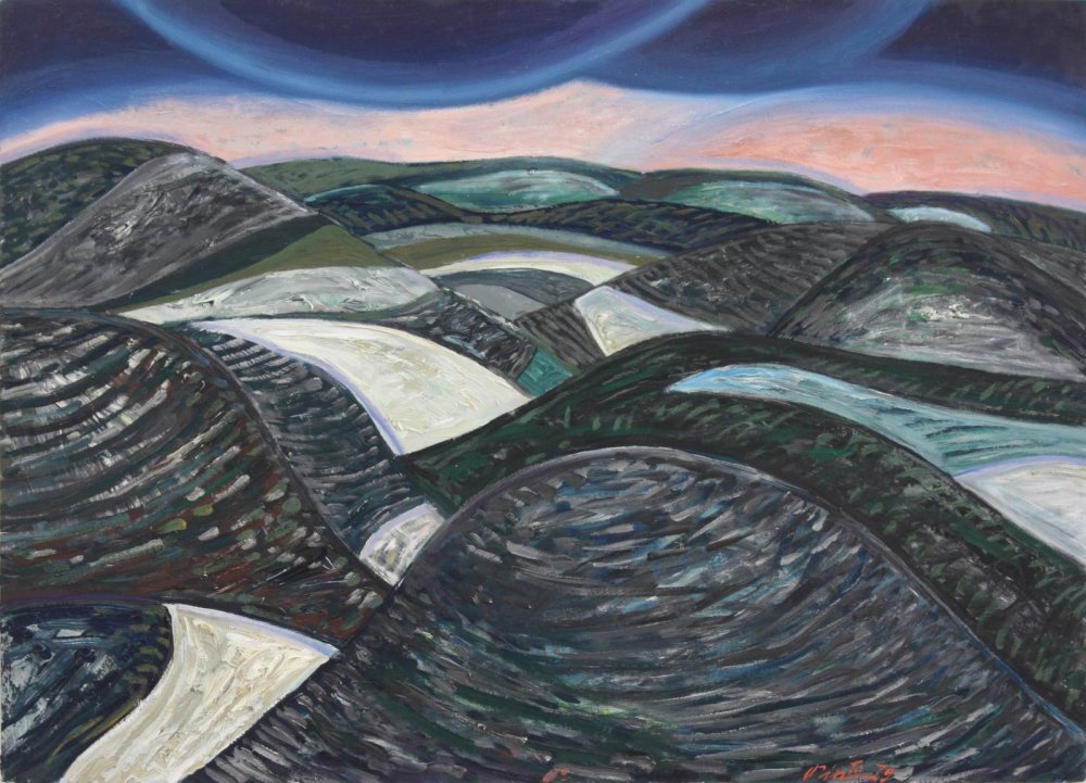 El artista nos transporta a un paisaje ondulante y dinámico, donde los elementos naturales se convierten en un juego de formas y colores intensos.## Las colinas, marcadas por trazos enérgicos y curvaturas repetitivas, parecen moverse como olas congeladas en el tiempo. Los tonos oscuros predominantes —negros, verdes y grises— se ven interrumpidos por áreas blancas y azuladas, que podrían representar caminos o ríos, añadiendo contraste y dirección al conjunto.