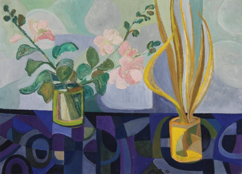Los jarrones, ubicados en el centro de la composición, son el punto focal de la obra y reflejan el equilibrio entre la estructura geométrica El jarrón de cristal con flores verdes y rosas se caracteriza por una transparencia sutil, lograda mediante el uso de capas de color que sugieren la interacción con la luz. Su contorno amarillo y verde refuerza su presencia y lo distingue del fondo, permitiendo que destaque dentro de la composición. El jarrón amarillo con hojas alargadas, presenta una presencia más sólida y opaca, con sombras y reflejos construidos a partir de planos de color en lugar de degradados. Las hojas alargadas rompen la horizontalidad de la escena, aportando una tensión visual que equilibra la composición y dota a la obra de dinamismo.