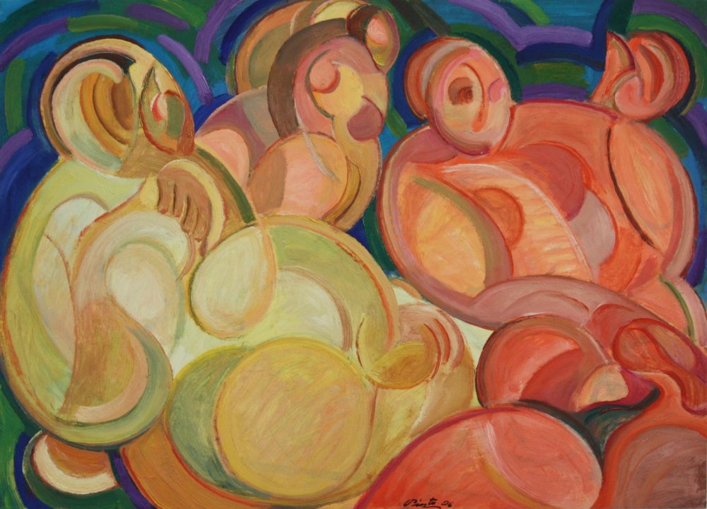 En esta obra, Miguel Pinto aborda el desnudo femenino desde una perspectiva profundamente personal y transformadora##. No pretende describir anatómicamente tres cuerpos, sino sugerirlos. Las tres mujeres aparecen fundidas en un entramado de volúmenes curvos y ondulantes que se entrelazan hasta casi disolverse en el espacio pictórico. Las formas redondeadas, amplias y envolventes evocan campos, colinas o geografías sensuales, en coherencia con su constante tendencia a convertir la figura en topografía emocional.