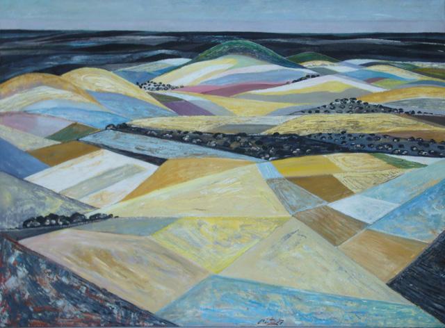 Este cuadro de Miguel Pinto representa un paisaje agrícola desde una visión elevada, casi aérea, pero no se limita a ser una reproducción topográfica: es una reinterpretación pictórica del territorio rural como organismo estructurado, complejo y profundamente humano##. Se trata de un paisaje intervenido por el ser humano, modelado por siglos de actividad agrícola, de roturación, de parcelación y de cultivo. El campo, en esta obra, aparece fragmentado en superficies geométricas, como si estuviese contemplado desde el recuerdo o desde una mirada que ordena la realidad con una lógica poética.