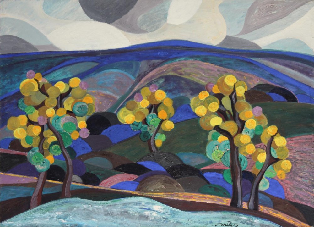 Los árboles, protagonistas de la escena, se representan con troncos oscuros y estilizados, mientras que sus copas están formadas por manchas circulares en tonos amarillos, verdes y violetas. Esta representación otorga un carácter casi onírico a la obra, destacando la experimentación del artista con la simplificación de las formas y la expresión cromática.