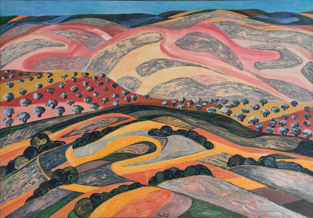 Esta pintura de Miguel Pinto se presenta como una celebración visual del paisaje cultivado, una visión intensamente colorista y rítmica del territorio rural##. Aquí, el campo no solo es representación, sino estructura, una organización casi coreográfica de formas y colores que convierte la tierra en un tapiz visual de gran dinamismo.