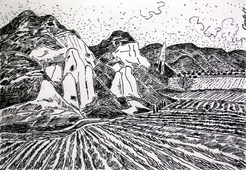 En primer término, campos labrados se extienden en surcos paralelos y amplios, mientras nubes leves y horizontes ondulados aportan aire y profundidad al paisaje seco.