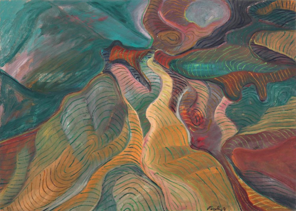 En Rotulando campos, Miguel Pinto lleva el paisaje castellano al umbral de la abstracción total, resolviendo colinas, surcos y campos labrados en un entramado de líneas onduladas y planos curvos que se entrelazan como surcos de arado##. Las formas serpentinas, trazadas con pincelada enérgica, generan un ritmo musical que sugiere el trabajo de la tierra sin describirlo literalmente.La paleta de verdes primaverales intensos, ocres, rojizos y rosados impregna la composición de vitalidad renovada, transformando el campo en una vibración sensorial donde cada trazo parece latir con la energía exuberante de la estación. Esta obra, perteneciente a su etapa abstracta, refleja la conexión del artista con Castilla en su dimensión más luminosa y fecunda.