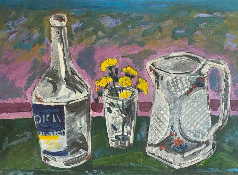 La obra “Jarra de Cristal” de Miguel Pinto, fechada 1970, representa un excelente ejemplo de su período figurativo, en el cual el artista explora la estructura, el color y la intensidad emocional de la pintura##. En esta pieza, se puede notar su característico uso de colores vibrantes y pinceladas enérgicas, elementos que refuerzan la expresividad de la escena y la fuerza visual de la composición, logrando un equilibrio entre la representación figurativa y la libertad expresiva.