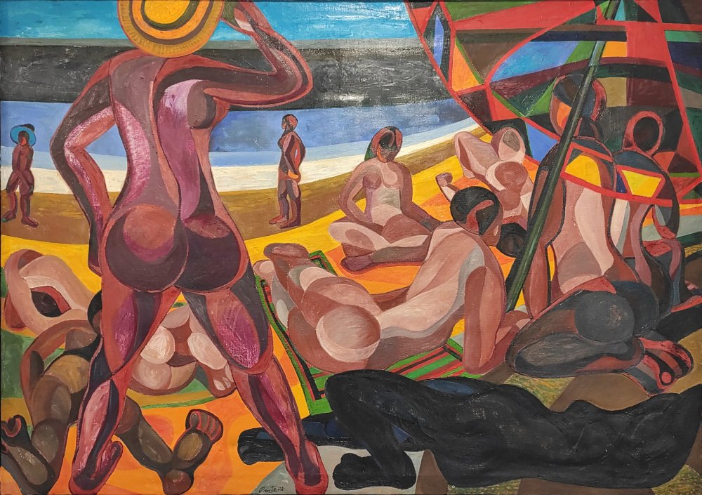 La sombrilla representa una escena de playa con figuras humanas estilizadas y formas curvilíneas, características de la etapa subjetiva de Miguel Pinto##. El artista transformaba la realidad a través de una visión poética y expresiva, utilizando el color y la composición para evocar sensaciones más allá de la simple representación visual.