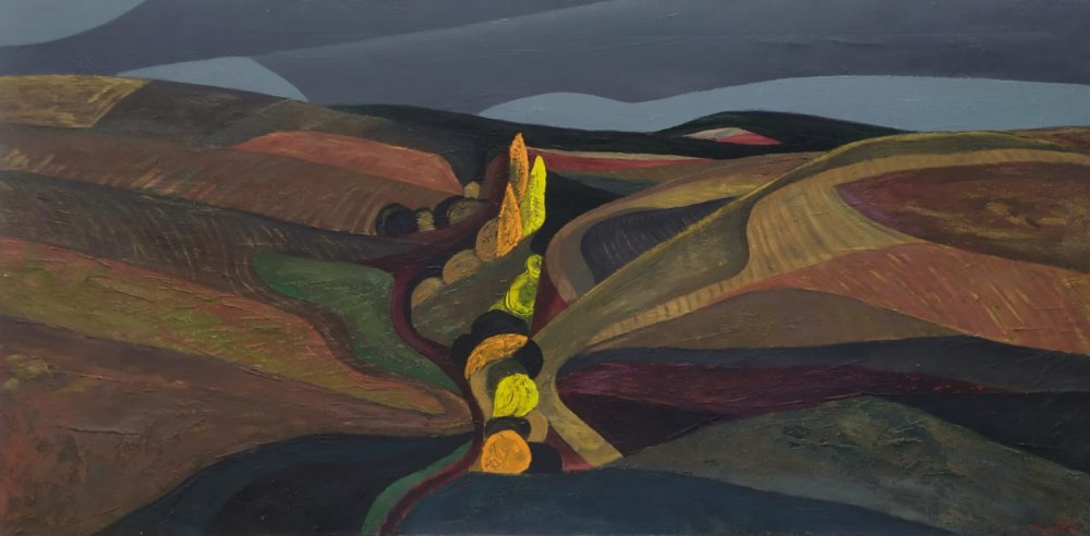 En la obra “Chopos”, Miguel Pinto presenta un paisaje estilizado con un fuerte énfasis en la geometrización y el color## .
