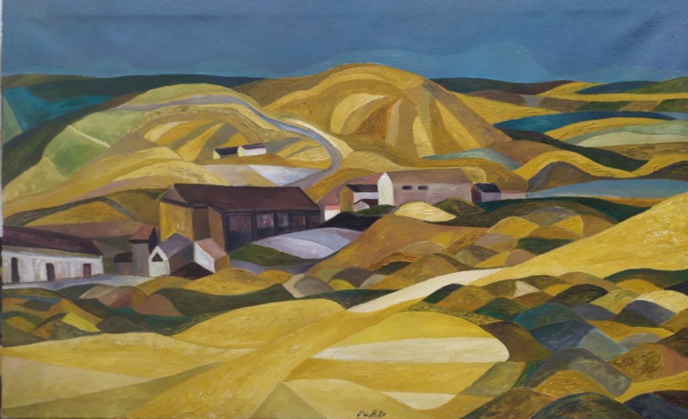 La composición está marcada por una estructura sólida y envolvente. Las colinas de escombros, que podrían ser visualmente áridas o caóticas, se convierten aquí en una sucesión armónica de formas curvas y geométricas, casi abstractas, que recorren el lienzo con ritmo interno. Las casas, dispuestas de forma orgánica entre las lomas, parecen incrustadas en la tierra, como si surgieran de ella. Esta integración entre lo construido y lo natural es un rasgo distintivo del lenguaje plástico de Pinto.