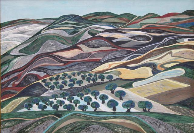 La composición se organiza a partir de una sucesión de líneas ondulantes, que recorren la superficie del cuadro delimitando colinas, valles y terrenos agrícolas. Estas curvas, marcadas por colores intensos como ocres, verdes, grises y trazos en rojo y negro, generan un efecto de relieve y profundidad, sugiriendo una tierra en constante transformación. La pincelada fluida y expresiva refuerza esta sensación de movimiento, haciendo que el paisaje parezca expandirse y contraerse como un organismo vivo.