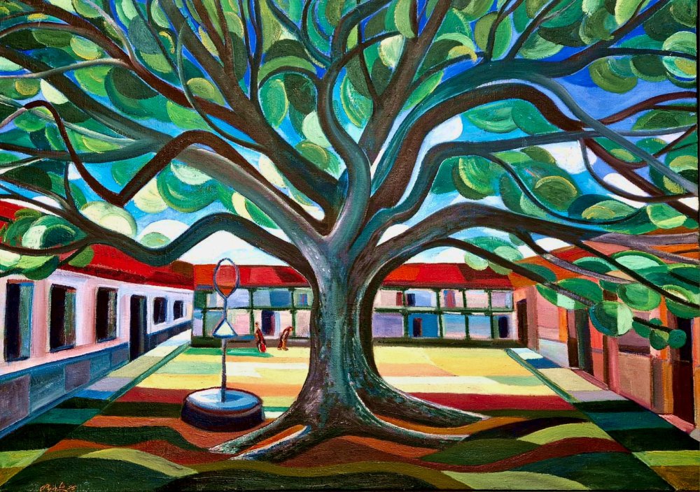 Pinto emplea una paleta cromática intensa, donde los verdes y azules del follaje transmiten frescura y vitalidad, mientras que los rojos y ocres en los tejados y el suelo generan un fuerte contraste y dinamismo. Las sombras proyectadas por el árbol refuerzan la tridimensionalidad y sugieren una iluminación intensa, del mediodía o primeras horas de la tarde. El suelo, representado con una variedad de formas y colores fragmentados, aporta un ritmo visual casi abstracto, característica recurrente en la obra del artista.