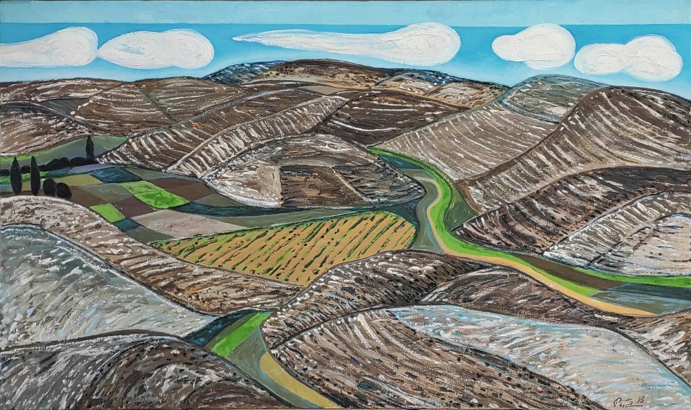 El cielo azul con nubes blancas crea un contraste con la aridez del paisaje, aportando luminosidad y una sensación de amplitud. Esta combinación de colores no solo representa el aspecto físico del lugar, sino que también transmite la idea de un terreno en constante transformación, marcado por el clima y la actividad agrícola.