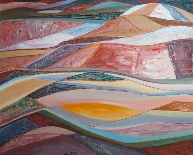 El cuadro despliega una composición en la que los cortes del terreno, los volúmenes erosionados y los estratos minerales se traducen en un lenguaje de curvas, planos y transiciones cromáticas. El artista rehúye cualquier forma de realismo, optando en su lugar por una abstracción lírica, donde las formas fluyen, se ondulan y se entrelazan como si de un organismo vivo se tratase.
