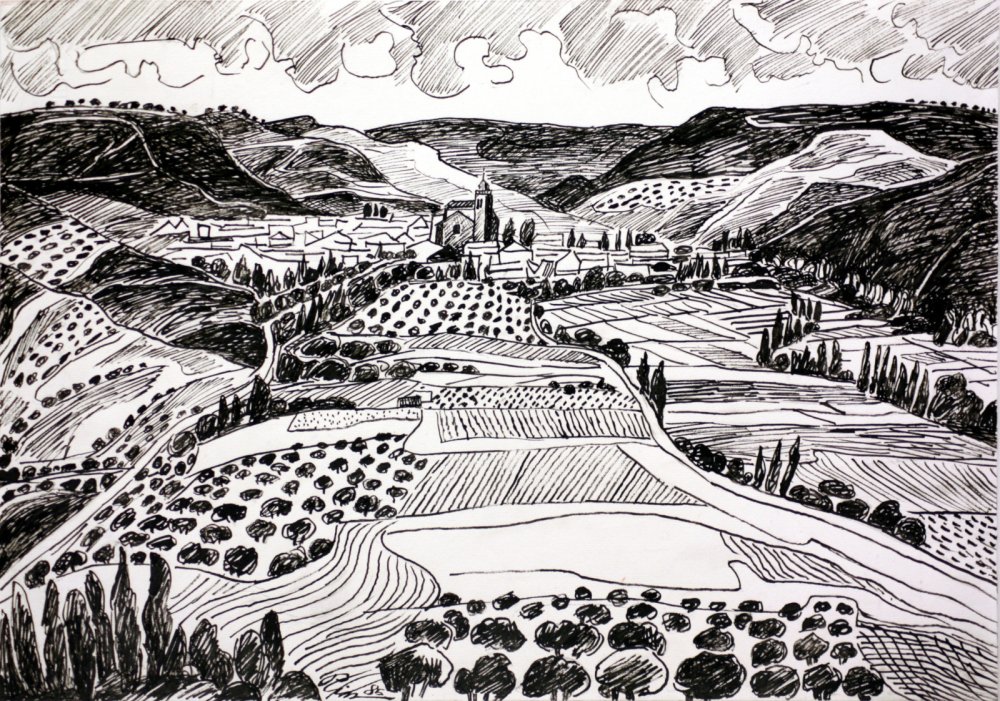 Esta obra en tinta china de Miguel Pinto sintetiza con trazo enérgico la memoria afectiva de su pueblo natal, visto desde una altura panorámica##.