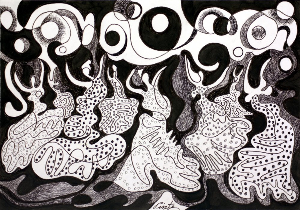Las líneas orgánicas y fluidas, junto con los juegos de positivo y negativo entre el fondo y las figuras, crean una sensación de vibración y movimiento constante, algo característico del estilo de Miguel Pinto en su exploración de la abstracción y el simbolismo.