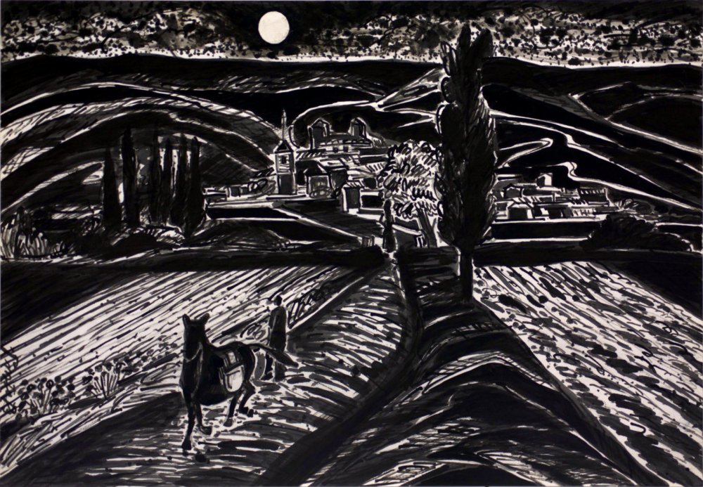 El campesino y el animal avanzan unidos sobre la tierra, formando una sola fuerza en movimiento, mientras los surcos se extienden con líneas ondulantes que recorren toda la composición. La noche, sugerida por los fuertes contrastes en blanco y negro y la presencia de la luna, envuelve la escena en una atmósfera silenciosa y profunda.